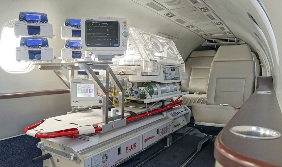 Fully equipped medically configured aircraft with advanced, including modern neonatal ICU units, isolette incubators, low-flow oxygen blenders, neonatal ventilators, defillators, intubation equipment, monitors for cardio-respiratory parameters, infusion devices, hypothermia capabilities, transport phototherapy equipment, and emergency medications.